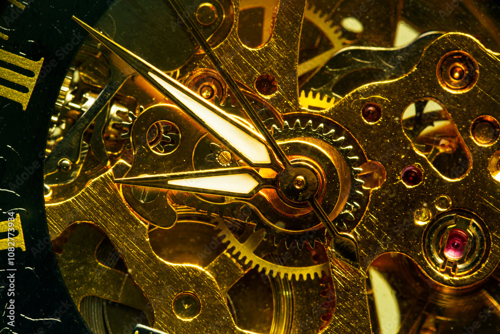 Close-up of a winding watch mechanism,Automatic mechanical wrist watch with black clock face and open balance, close-up photo with selective focus
