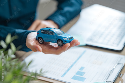 assurance, contract, insurance, investing, numbers, financial, rental, investment, protect, protection. A person is holding a blue toy car in their hand on a piece of paper with numbers and graphs.