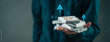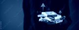 wealth, earning, invest, management, profit, value, earn, earnings, savings, payment. A man is holding a stack of money. The money is piled up and the man is holding it up with his hand.