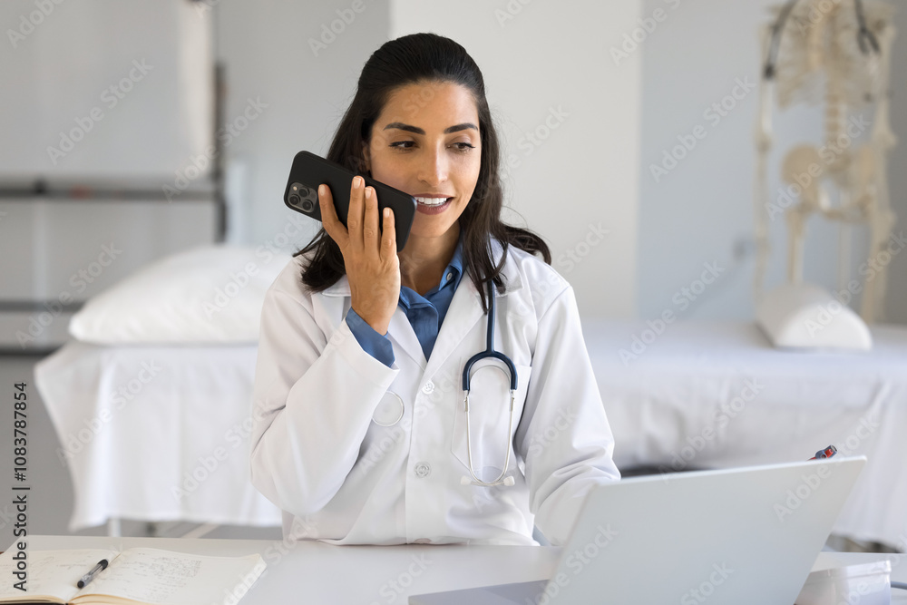 Latina woman therapist speak to clinic patient on speaker phone using smartphone at workplace, record voice audio message, use modern innovative tech, leave voicemail to colleague regarding workflow