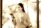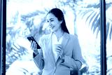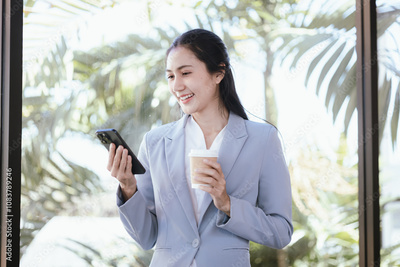 Asian businesswoman using smartphone while standing drinking hot coffee in cafe