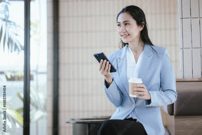 Asian businesswoman using smartphone while standing drinking hot coffee in cafe