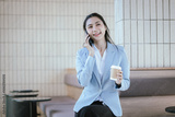 Asian businesswoman using smartphone while standing drinking hot coffee in cafe