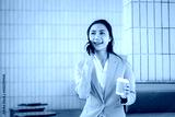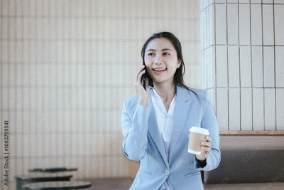 Asian businesswoman using smartphone while standing drinking hot coffee in cafe