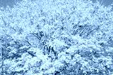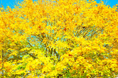 Beautiful, large maple tree seen in autumn in a park in Britain. Seen against a blue sky, just before the leaves begin to fall.