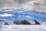 Patagonia winter wildlife. Mounatin lion in snow. Puma in the nature mountan winter habitat with snow. Wildlife neture in Torres del Paine NP in Chile. Winter with snow.