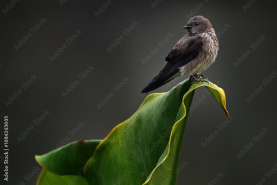 Mascarene martin, Phedina borbonica, passerine bird, sitting on the green leave in the nature habitat, Andasibe-Mantadia NP in Madagascar. Grey bird Mascarene swallow.