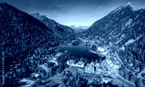 Amazing aerial autumn drone view of mountains, lake and village at Champex-Lac in the Swiss Alps in the Canton of Valais