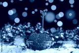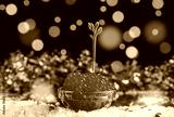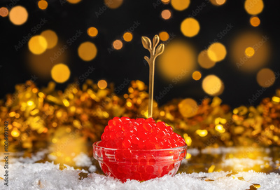 Salmon Red Caviar in bowl on a festive table with defocused Christmas lights at background. Luxury delicacy food, copy space