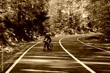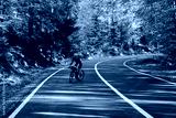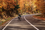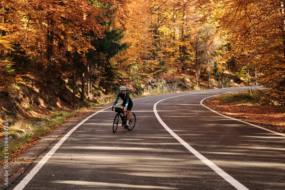 Woman cyclist rides on an asphalt road through a scenic autumn forest. Golden leaves create a vibrant backdrop for this active outdoor scene. Perfect for travel, sports, and nature themes.