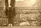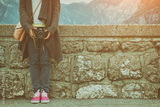 Hipster holding a retro camera outdoors.