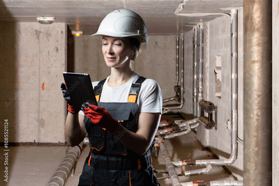 Woman engineer. Girl builder is standing in basement. Engineer with electronic tablet. Woman is pipeline maintenance technician. Boiler system pipes behind woman. Girl engineer in gray overalls
