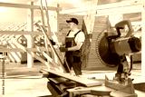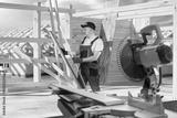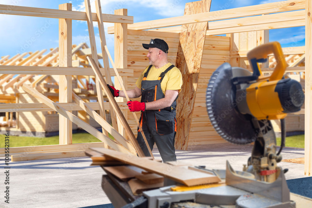 Man builder at work. Construction crew worker with wooden planks. Erection of breaststroke cottage. Stationary circular saw near construction worker. Man engineer under frame of wooden house