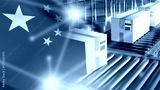 Conveyor with parcels. Flag of China. Production at PRC. Parcels from people republic of China. Production of goods in China. Cardboard boxes with PRC banner. Automatic production line. 3d image
