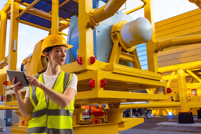 Woman near gas distribution station. Engineer on territory of industrial factory. Female technologist holds tablet. Inspector inspects gas distribution station. Industrial equipment behind contractor