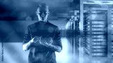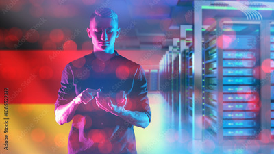 Man system administrator. Flag of Germany. Server equipment. Hosting center in Germany. Equipment for big data processing. Man system administrator holds electronic tablet. Telecommunications Germany
