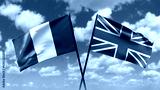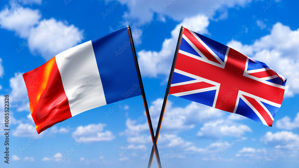 Flags of France and Great Britain. United kingdom banner on flagpole. National symbol of France under blue sky. Flags of two collaborating countries. Partnership with Great Britain. 3d image
