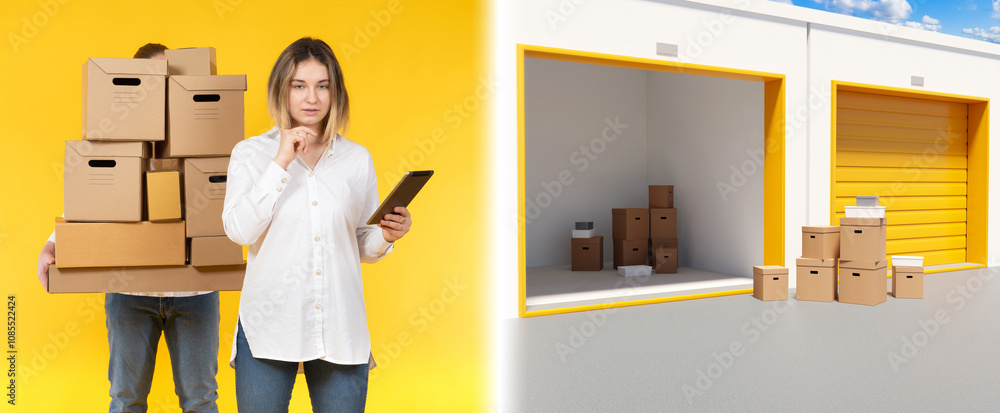Woman rents storage unit. Individual storage for personal belongings. Girl with phone near pantry. Rent self storage unit. Street warehouses under blue sky. Woman books storehouse via phone