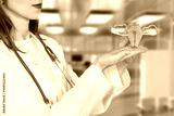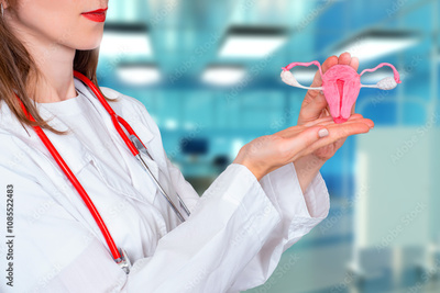 Model of uterus and ovaries in hands of doctor. Women health concept. Nurse demonstrates model of healthy uterus. Treatment female reproductive function. Girls genitals. Cropped doctor inside clinic
