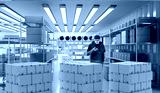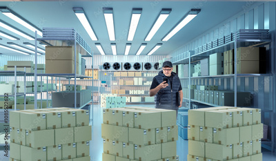 Man worker inside industrial refrigerator. Refrigerated warehouse. Man stands in food freezer. Refrigerated warehouse with cardboard boxes on racks. Supervisor with phone inside large refrigerator