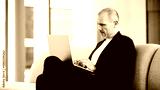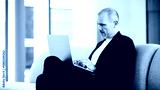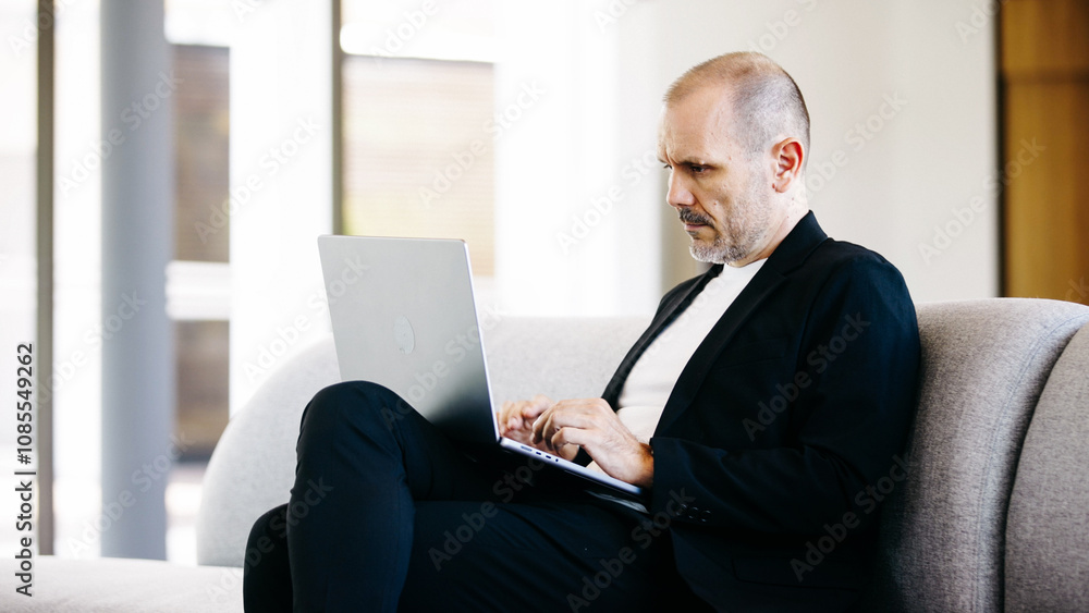 Businessman uses laptop computer in office lobby. Middle-aged man, entrepreneur, small business owner, working online at a laptop.