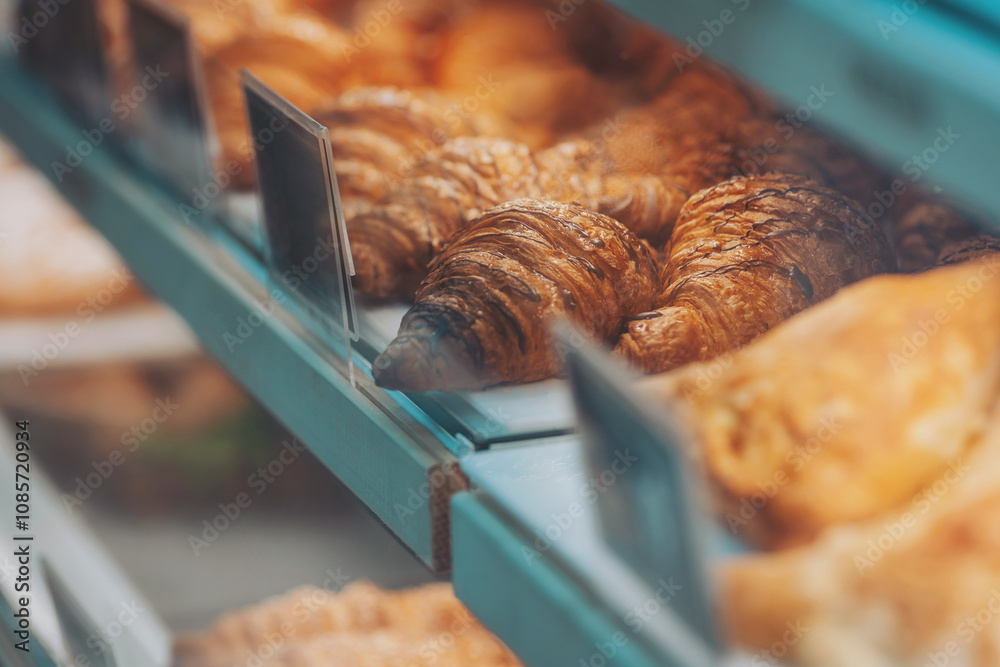 Interior details at the bakery and coffee shop. Bistro showcase with shelves of freshly croissants and bread in assortment. Zero waste shop or sustainable local small businesses at food service.