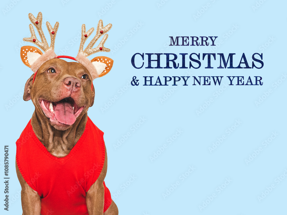 Happy Holidays. Lovable dog and congratulatory inscription. Closeup, indoors. Day light, studio shot. Congratulations for family, relatives, loved ones, friends and colleagues. Pet care concept