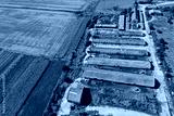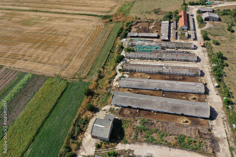 Bio farm, countryside cowshed, hangars, dairy cows, bio agricultural fields aerial