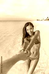 Follow me concept. Asian girlfriend leading man holding hand. Happy multiracial woman in blue bikini with sexy and slim suntan body. Couple in love walking on tropical beach vacations summer travel.