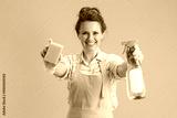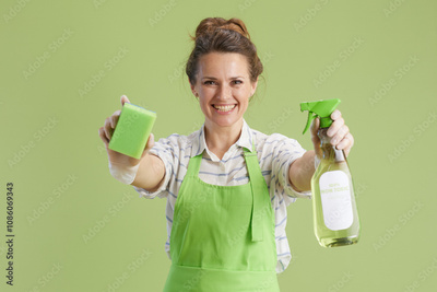 happy female in green apron and rubber gloves against green
