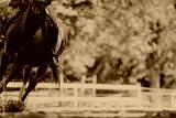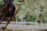 A dynamic image of a brown horse galloping in an outdoor arena, kicking up dust and displaying agility and strength amidst lush greenery.