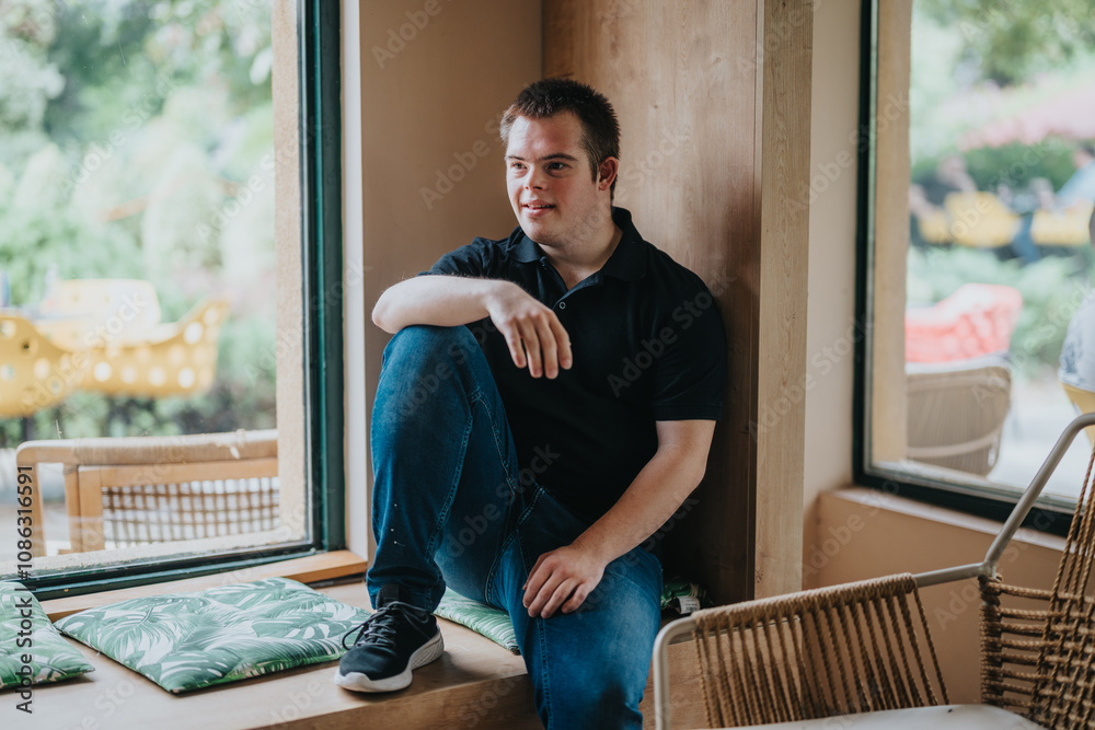 A young man in casual clothing sits by a window, creating a calm and reflective atmosphere with an outdoor view in the background.