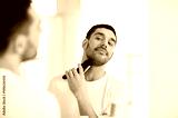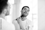 man shaving beard with trimmer at bathroom