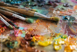 artists brushes and oil paints on wooden palette