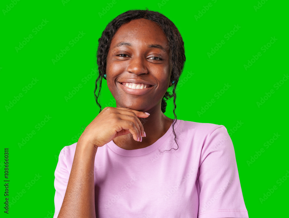 Young woman smiling joyfully in a pink shirt against a vibrant green background in a cheerful atmosphere