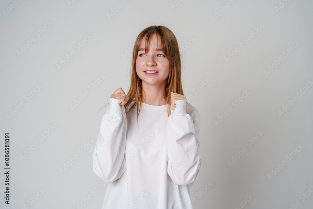 A joyful young girl with long hair wearing a white sweater stands against a plain background