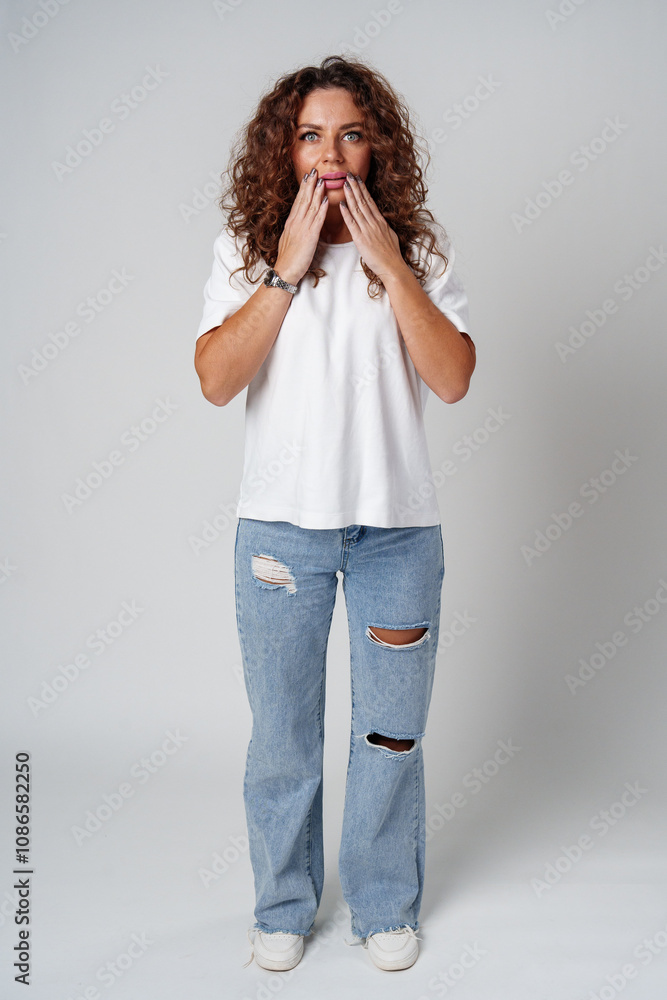 Surprised woman expressing strong emotions with wide eyes and raised hands, studio setting
