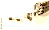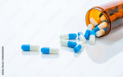 Prescription antibiotic capsules spilling from amber bottle onto a white background. Blue and white capsule pills. Ideal for healthcare, pharmaceutical treatments, and medical medication industries.