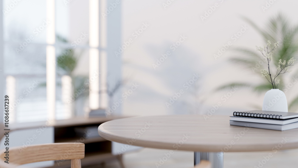 A close-up of a space on a round wooden table in a minimalist white and bright living room.
