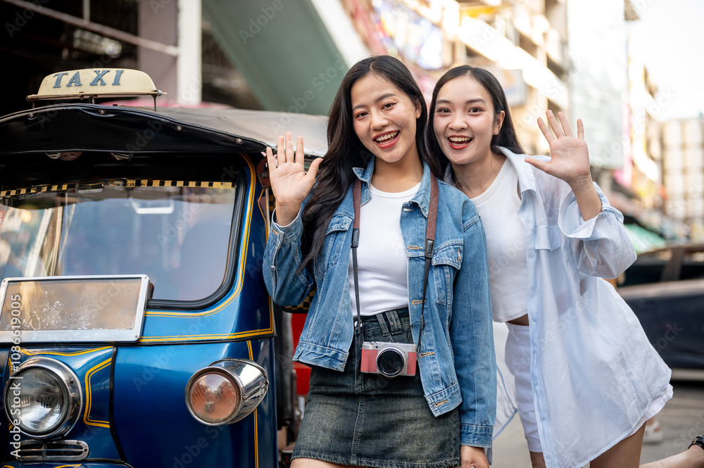 Beautiful Asian female tourists stand by a tuk-tuk on the street, enjoying their trip in Thailand.