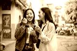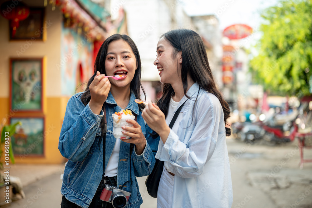Two pretty, joyful Asian female tourists enjoy street food at a market in Thailand, eating ice cream