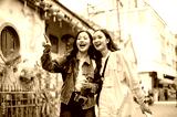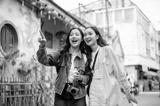 Two joyful young Asian female tourists explore the city in Thailand together, finding their location