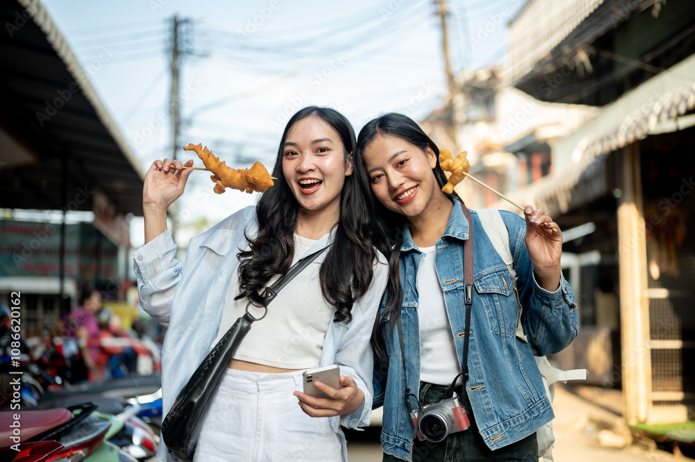 Two beautiful Asian female tourists are enjoy street food in Thailand while exploring the city.