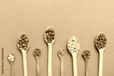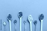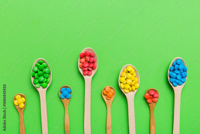 delicious colorful sweet candies on spoon on colored background . Confectionery decor top view with copy space