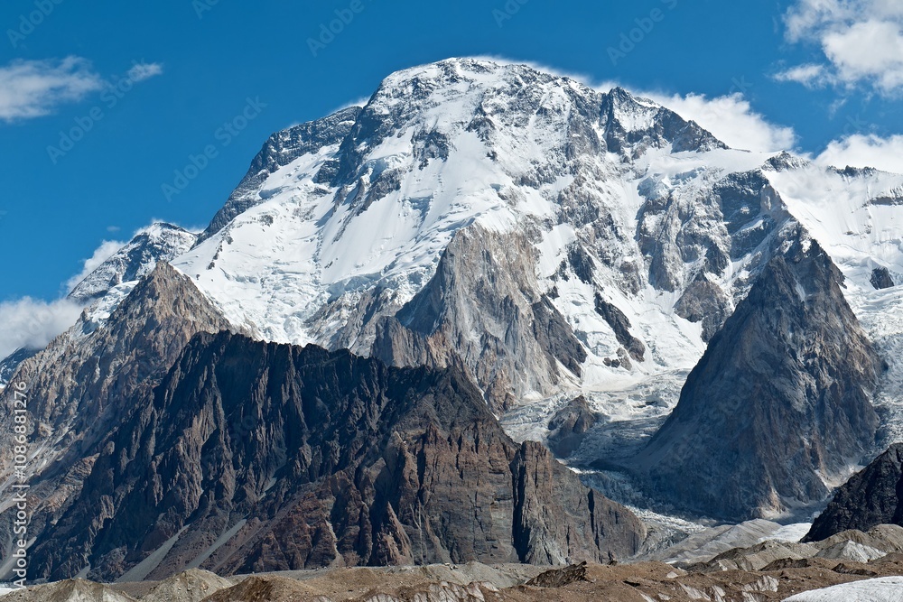 The view from the Concordia camp, located on the Baltoro glacier, on Broad Peak 8,051 meters high. Karakoram Mountains. Gilgit-Baltistan region. Pakistan. Asia.