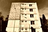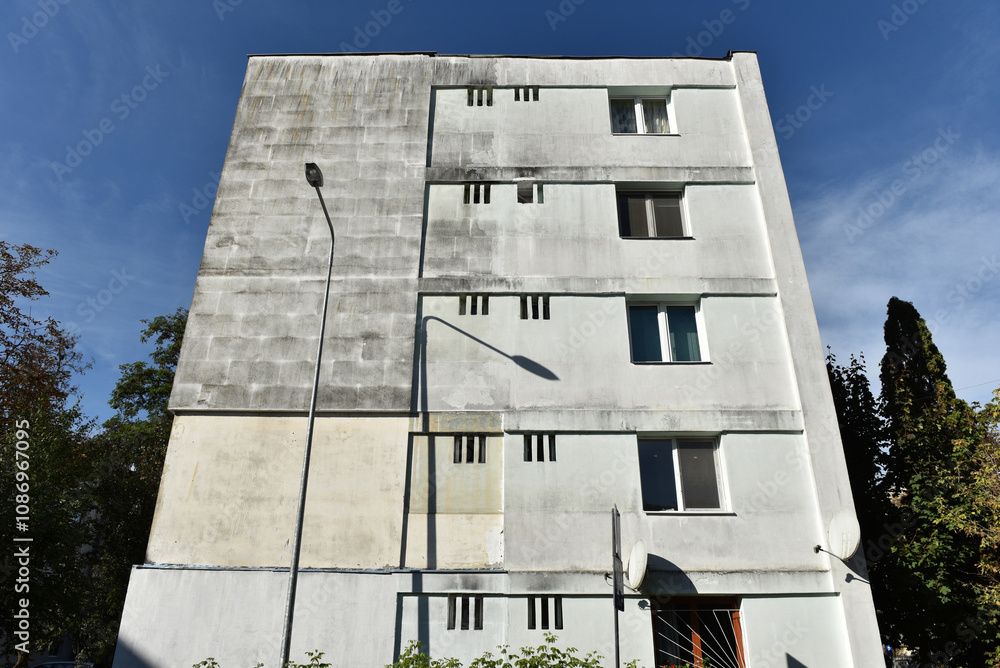 Typical facade of concrete panel building. Post Soviet flat of blocks