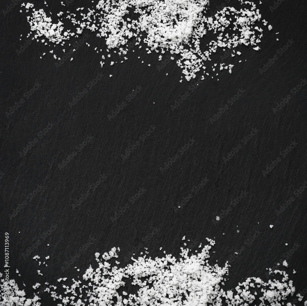 Organic sea white salt on a black slate background. Concept of cooking natural healthy food