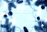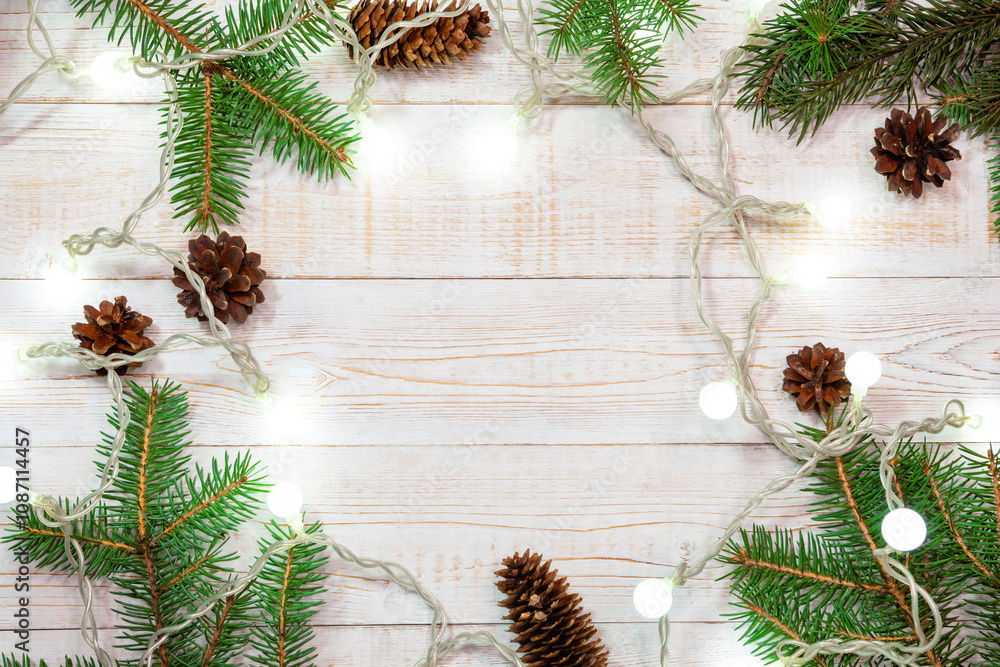 Christmas background - fir branches, pine cones and light garland on a white wood table. Flat layout, top view composition border with copy space