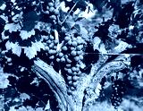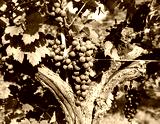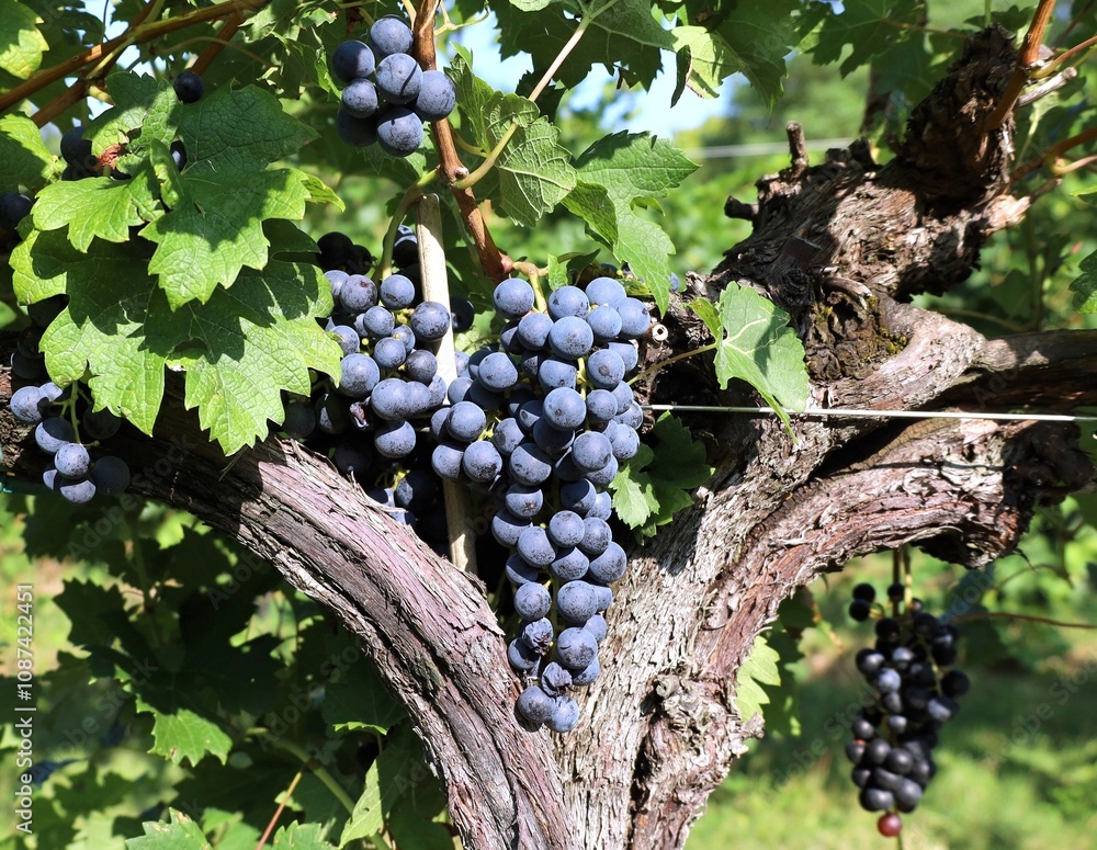 Bunch of ripe merlot hanging on vine over its grape vine trunk tree