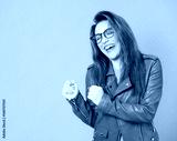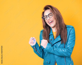 Amused beautiful young woman with closed eyes and clenched fists, wearing blue leather jacket, isolated on yellow background. Yes concept. Amusing girl celebrates success